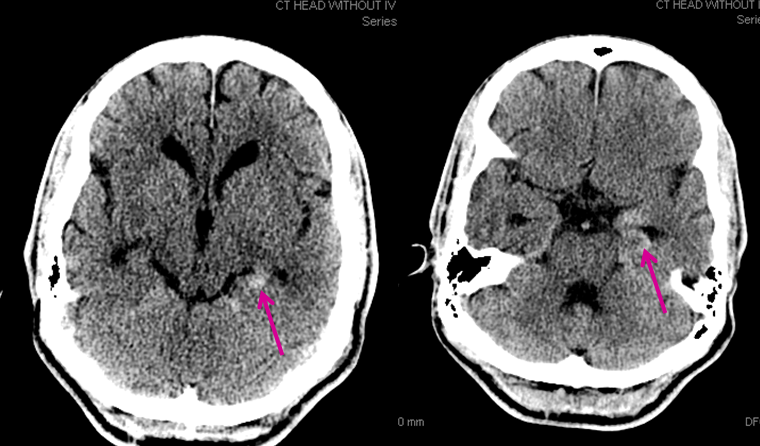 Sometimes we get a glimpse into the world of disease not usually evaluated by cerebral angiography. No doubt, this is a rediscovery of long forgotten facts from pre-cross-sectional era. This 60+ patient came in with mild confusion and amnesia. A CT scan showed hyperdensity in the posterior left hippocamal formation (pink arrows), which was initially interpreted as being in the adjacent perihippocampal cistern, raising the specter of subarachnoid hemorrhage.