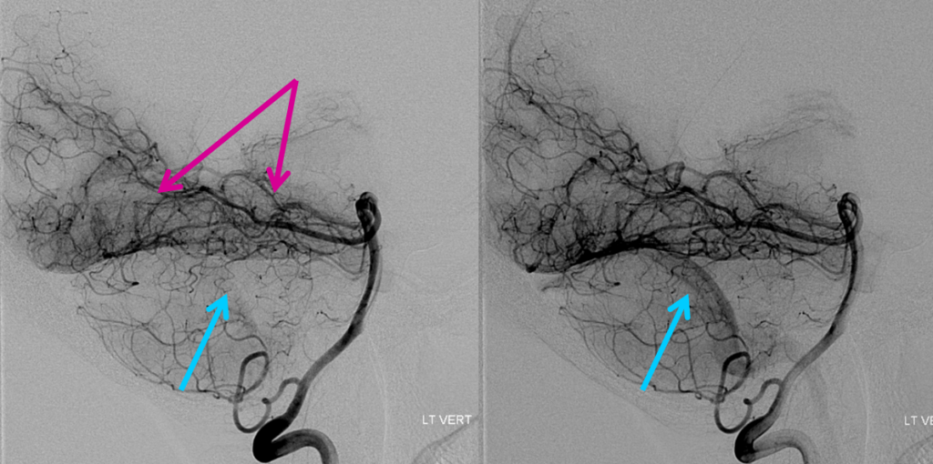 Example of another way to attack an ACOM — feasible when both A1 and A2 branches at least ~1.5 mm in diameter. Bilateral A1 to A2 flow diverter implantation can be technically challenging but ultimately effective